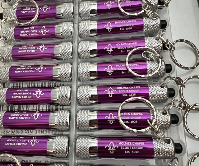 Branded key ring torch, really quite bright for the size.